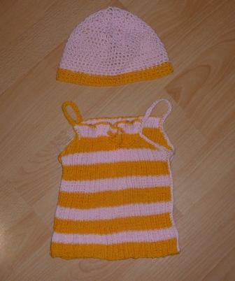 Маечка связана спицами, шапочка - крючком.