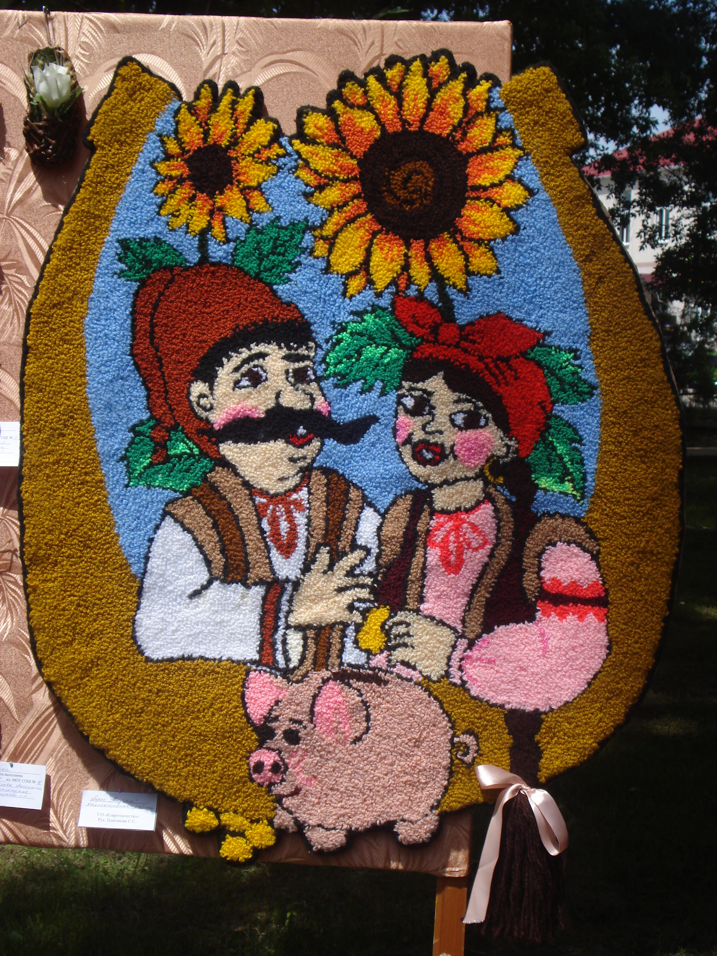 коврик изготовлен при помощи специальной иглы, полушерстяными нитками на мешковине