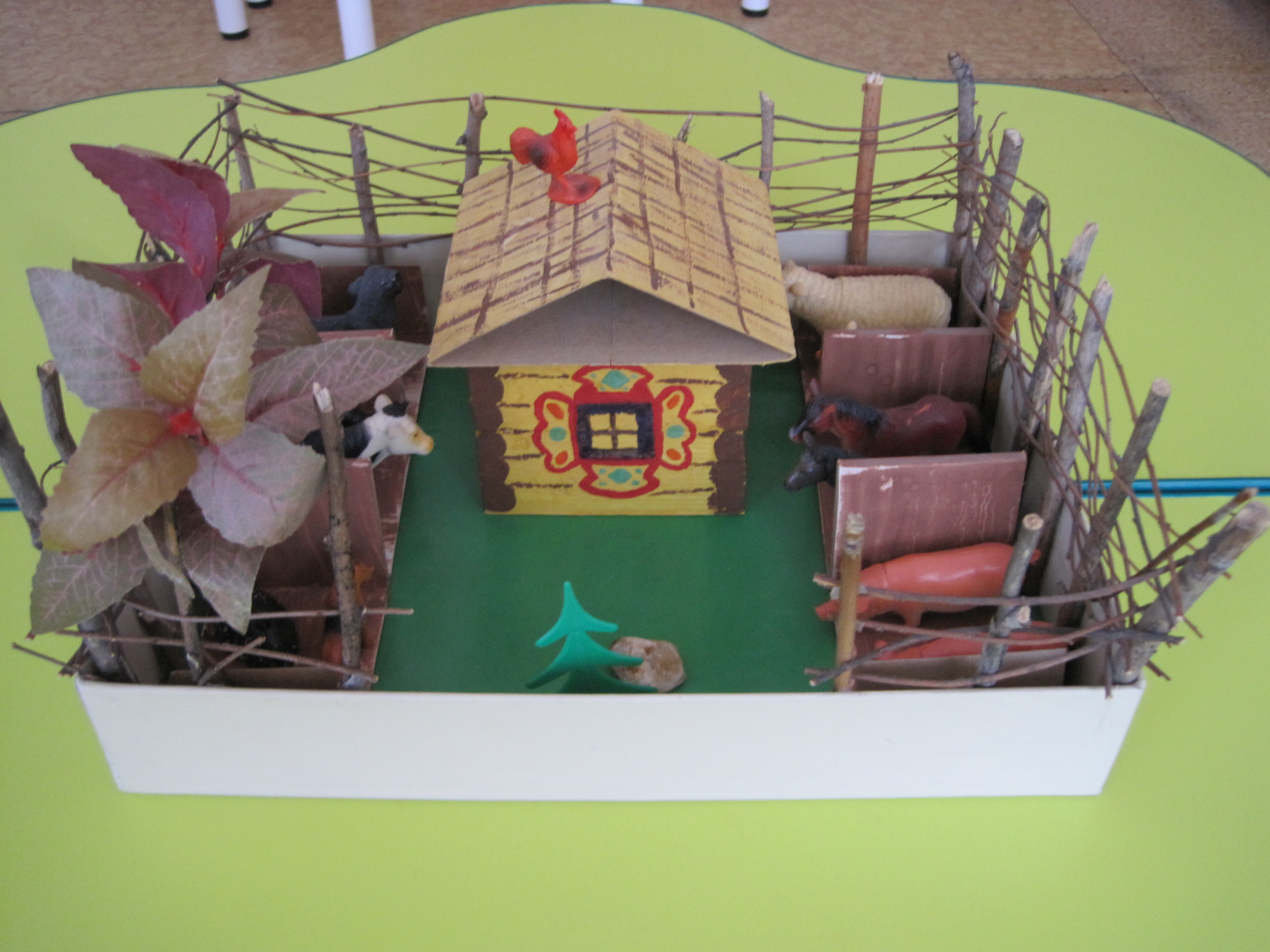 1. Беру картонную коробку размером 35х30см, высотой 6см 2. На дно кладу зеленый лист картона. 3. По периметру коробка обклеивается самоклеющейся лентой бежевого цвета. 4. По всему периметру приклеиваю 24 толстых веток карагача, используя клей «Момент». 5. Тонкими ветками переплетаю как корзинку весь периметр корзинки, оставив 6. «вход» шириной 16см. 7. Получился деревенский забор шириной 13 см. 8. Взяла лист картона шириной 7см, выкрасила коричневой гуашью смешанной с клеем ПВА (чтобы не пачкалась). 9. Высушила, и сложила так, чтобы получилось по 3 отсека справа и слева от входа (9 длина, 7 высота). 10. На картоне размером 11,5х11,5 приклеены на клей ПВА Прямоугольники из пенопласта (размером 11,5х4см). 11. На каждую сторону понадобилось по 2 прямоугольника. Итого 8 штук. 12. Крышка сделана из листа картона (размером14х30см), сложенном в виде треугольника (основание14см, высота с двух сторон по 8см. 13. Стены домика раскрашены гуашью смешанной с клеем ПВА в виде деревянных 14. Бревен, а так же нарисованы дверь и окна. Крыша раскрашена в виде черепицы. 15. В левом крайнем отсеке поместила искусственное дерево. 16. Во всех остальных отсеках – домашние животные по парам. 17. На крыше дома на двухсторонний скотч приклеен петух. 18. Рядом с домом сидит собака. 19. Работа готова.