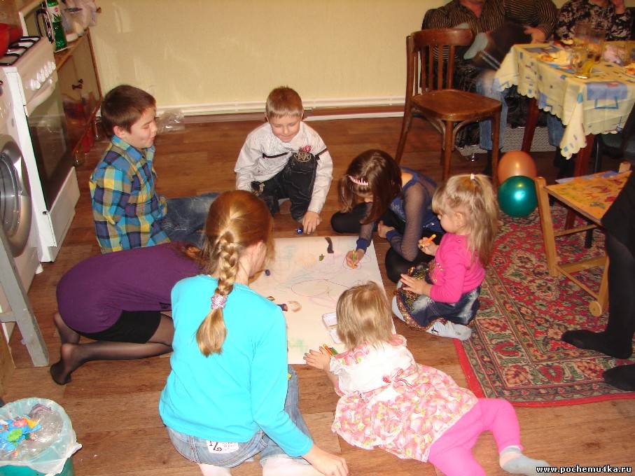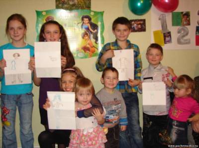 | Далее, творческий коллаж. Каждому дитенку выдали конверт к котором лежала часть тела и какой то подарок, надо было дорисовать Анюту и связать ее с подарком. Вот что вышло)  Еще было шуточное поздравление и беспроигрышная лотерея и конкурс "существа" Мне очень понравилось, что старшики не обижали малышей.