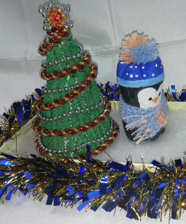Елочка выполнена из макаронных изделий а снеговичок из бутылки!