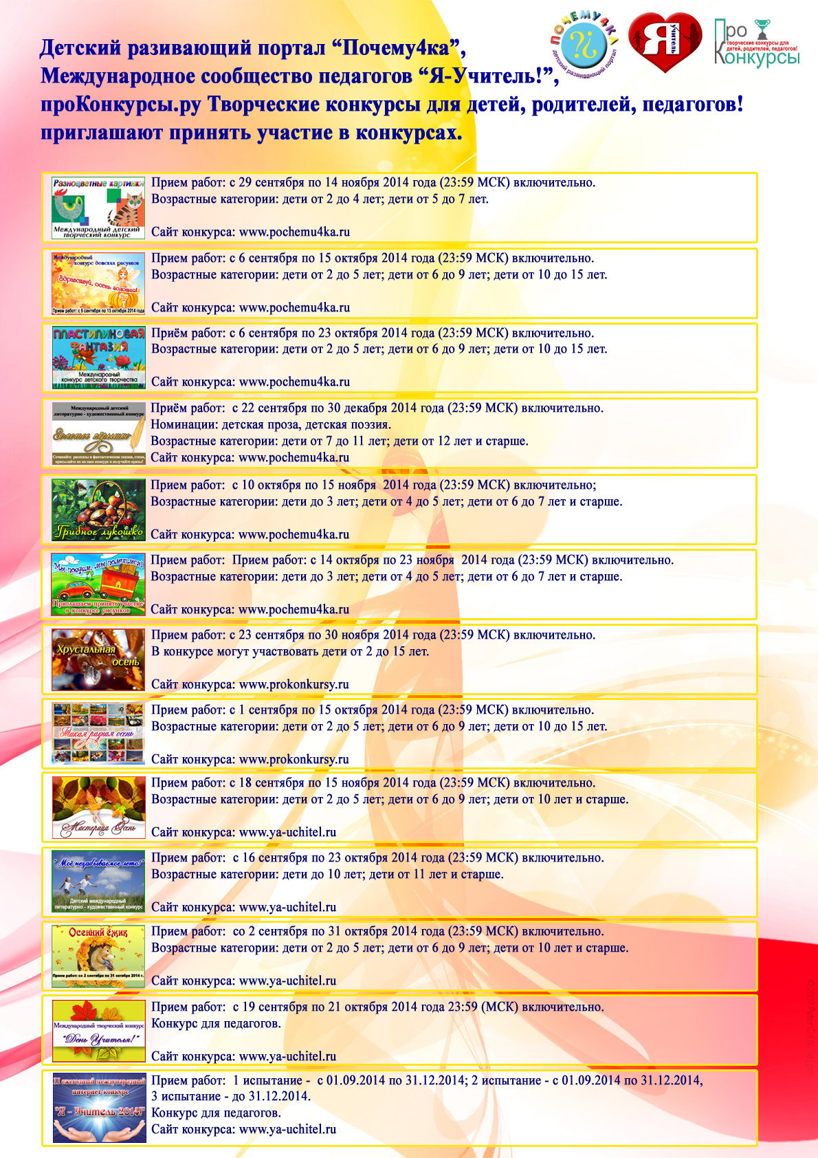 Сегодня мы знакомим вас с с нашим графиком конкурсов на октябрь 2014 года. И уже не за горами информация на ноябрь!