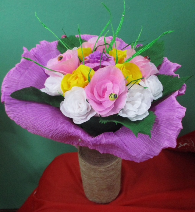 Букет выполнен из гофрированные бумаги, мешковины, нити .