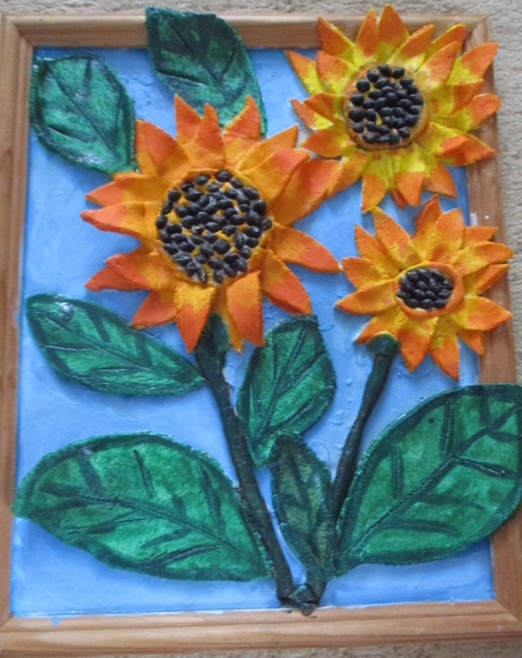 Подсолнухи выполнены из солёного теста, семечек, акварели