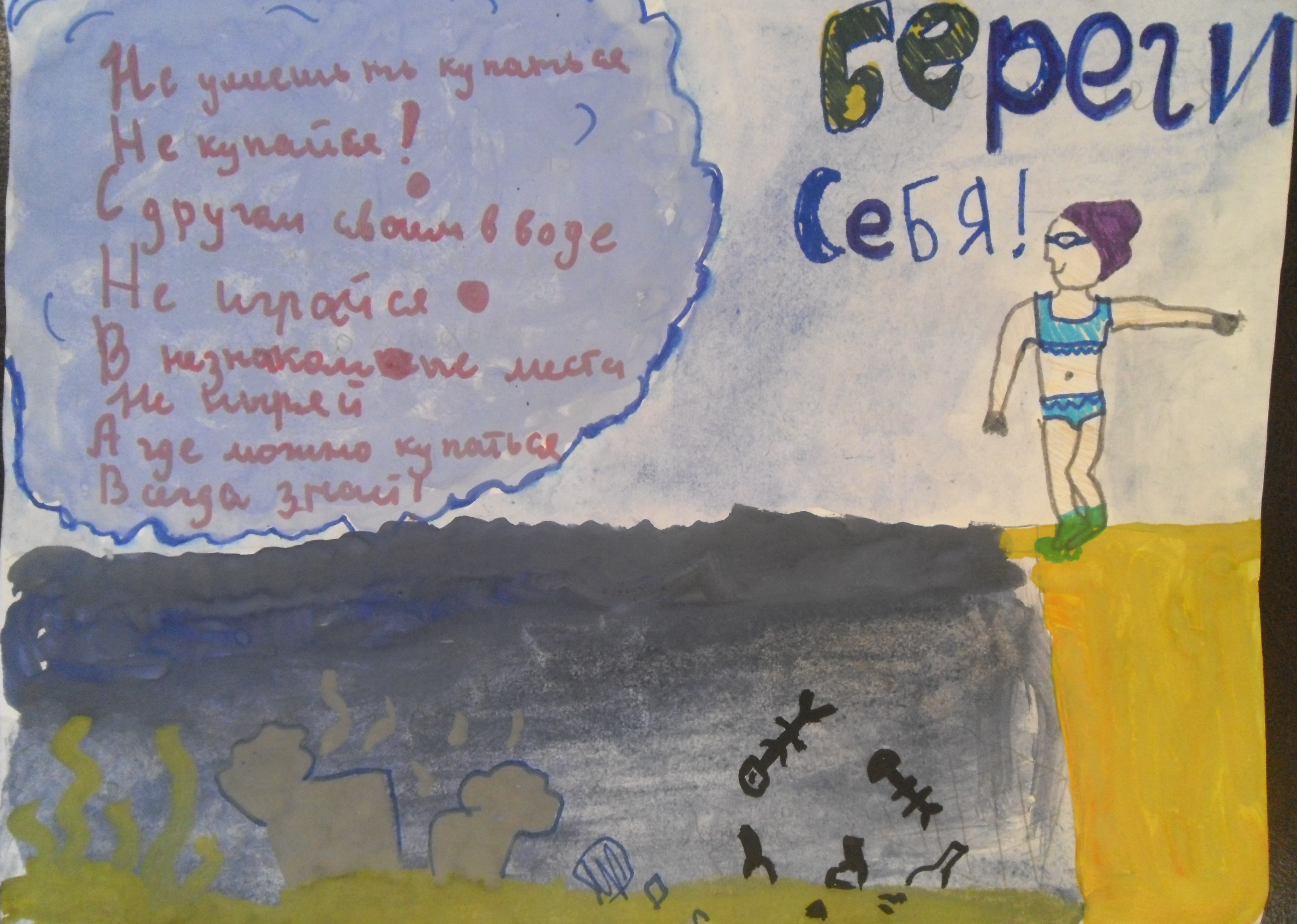 Рисунок выполнен акварелью и фломастерами. река изображена мрачно и пугающе, чтобы те кто посмотрел на этот рисунок- передумал купаться в запрещенных местах.