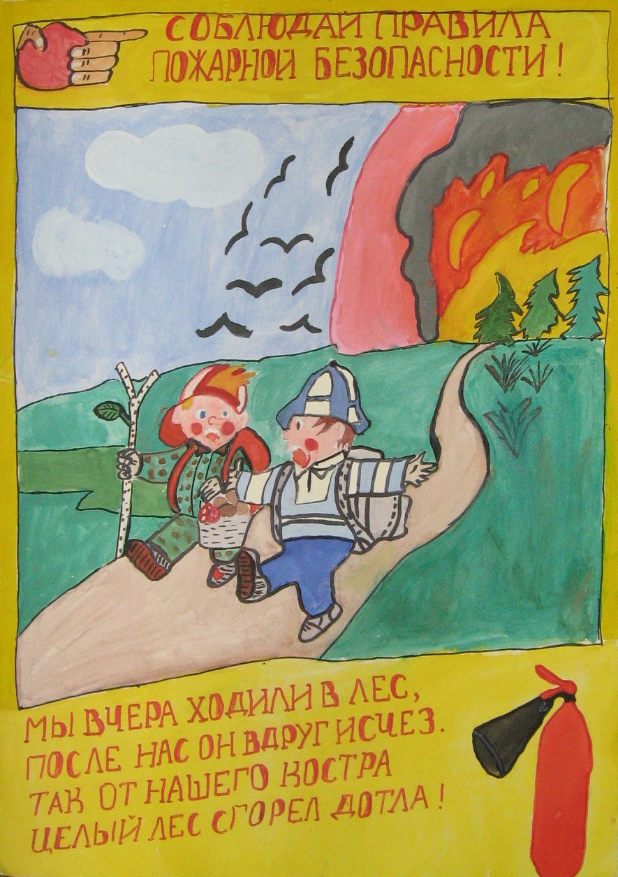 Материал: гуашь. В последнее время участились лесные пожары. Причиной которых является безответственное отношение людей к окружающему миру. Этим плакатом мы обращаемся к людям: Берегите нашу природу! Очень - очень важные правила! Ребята, помните о том, Что нельзя играть с огнём. Кто с огнём неосторожен, У того пожар возможен!