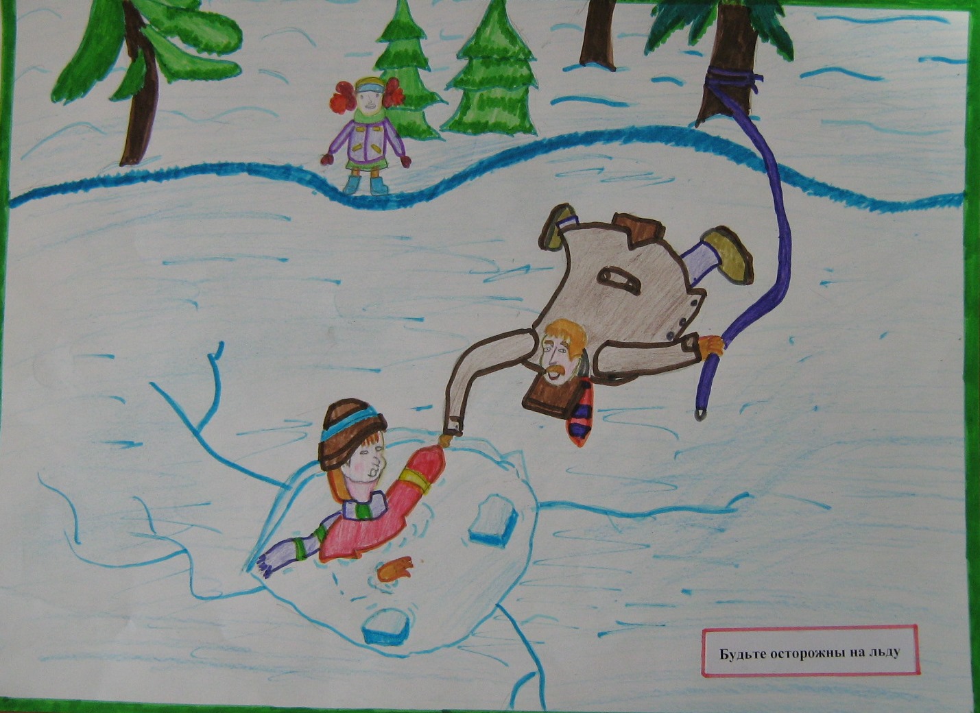 На внеклассном занятии нам рассказали о мерах безопасности и правилах поведения на льду. Я решил нарисовать о том, что находиться на неокрепшем льду нельзя. Что это может привести к трагедии.