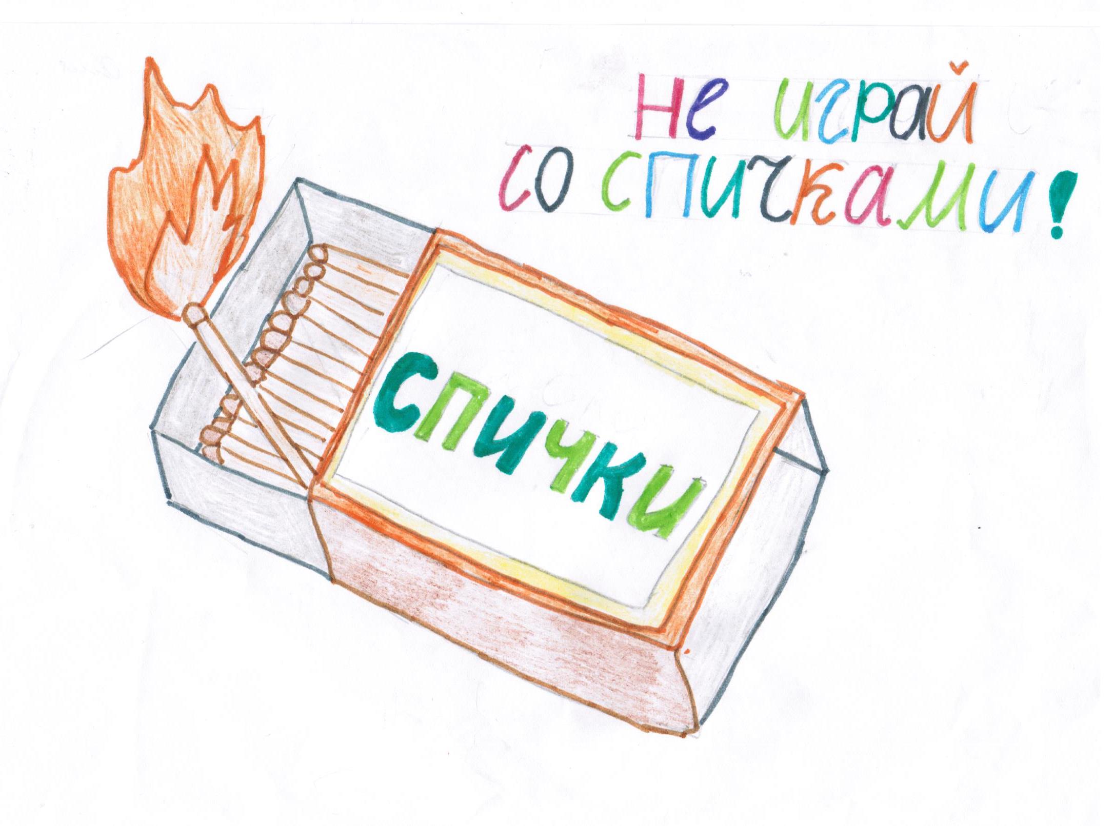 Огонь может привести к тяжким последствиям. Если играть со спичками, то может случиться пожар. Огонь - это очень опасная вещь, ведь она может привести к ожогам. Не играйте с огнем! У меня есть маленький брат и сестра, которые не знают, что играть со спичками нельзя, поэтому я нарисовала такой плакат.