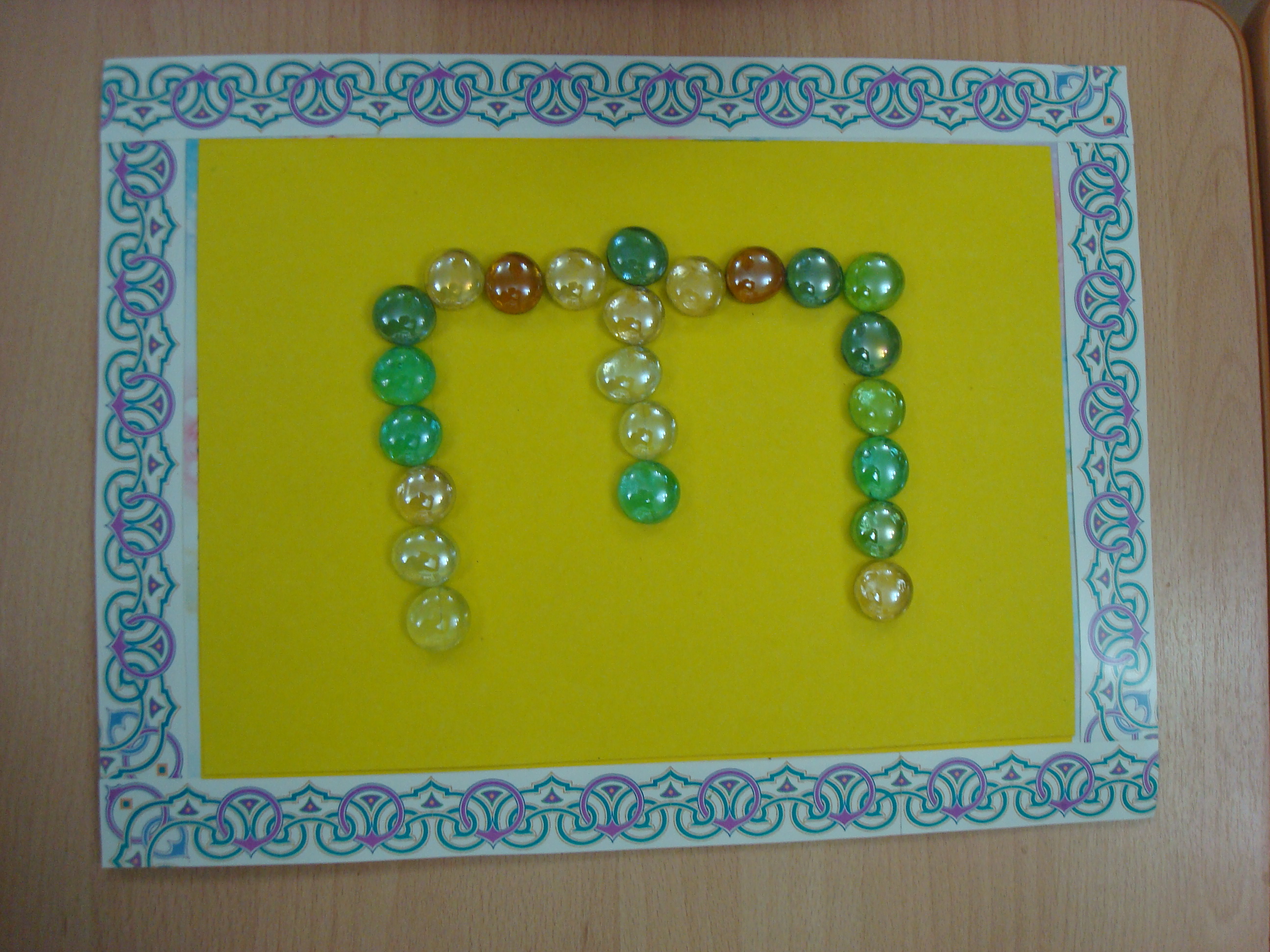 Василиса выложила букву "Ш" по карандашным линиям, нарисованным воспитателем, затем с помощью двухстороннего скотча закрепила их на цветном картоне.