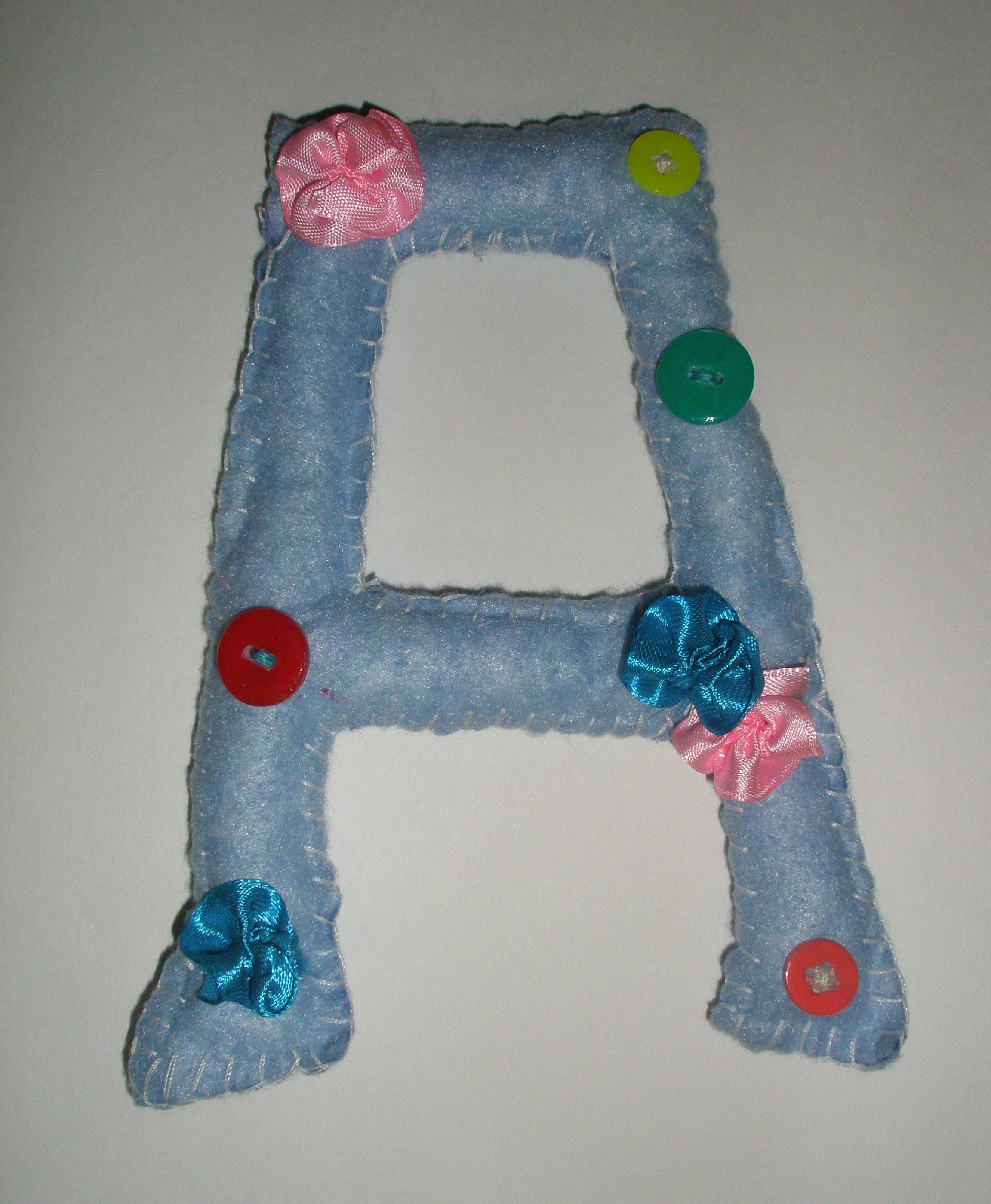 Выкройка буквы "А" из голубой плотной ткани. Обметена с помощью иголки белой ниткой. Внутри наполнена синтепоном. Украшена цветочками из атласных лент голубого и розового цвета, а также пришиты разноцветные пуговички.