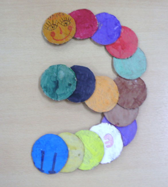 Я обвёл бокал на картоне и у меня получились круги. Раскрасил круги красками и собрал из них букву Э