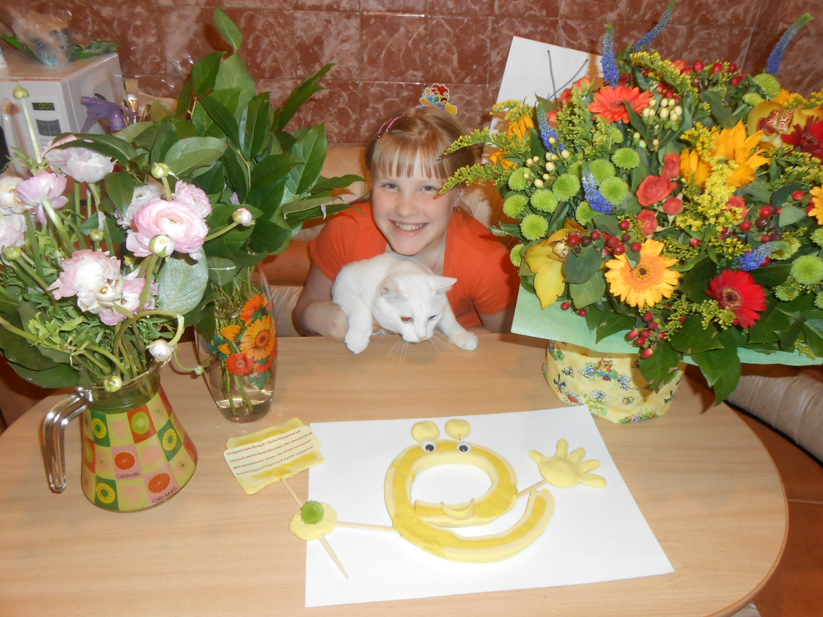 Буква сделана из солёного теста. В тесто добавлена жёлтая пищевая краска для пасхальных яиц. Весь процесс изготовления сфотографирован.
