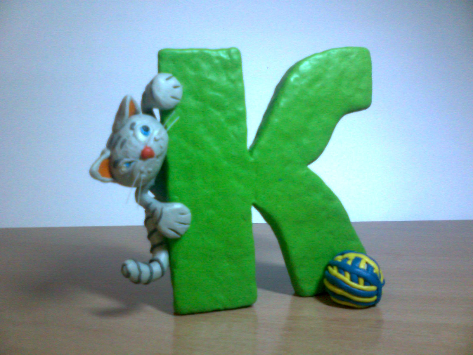 Работа выполнена из пластилина. Лепка замечательно развивает мелкую моторику рук. Это, хорошо влияет на развитие ребёнка. Кот. 1. Скатайте туловище кота из пластилина серого цвета. 2. Вылепите лапки, стекой обозначьте когти. 3. Соедините туловище и лапки. 4. Скатайте голову и ушки. 5. Сделайте глазки, носик, рот. 6. Соедините детали. Из щётки возьмите 4 щетинки и сделайте усик. 7. Соедините голову и туловище. 8. Скатайте тонкие жгутики из чёрного пластилина. Оформите голову, туловище коту черными полосками. 9. Скатайте жгут из серого пластилина оформите его черными полосками - хвост готов, соедините его с туловищем. Кот готов. 10. Посадите кота на заранее вылепленную букву.