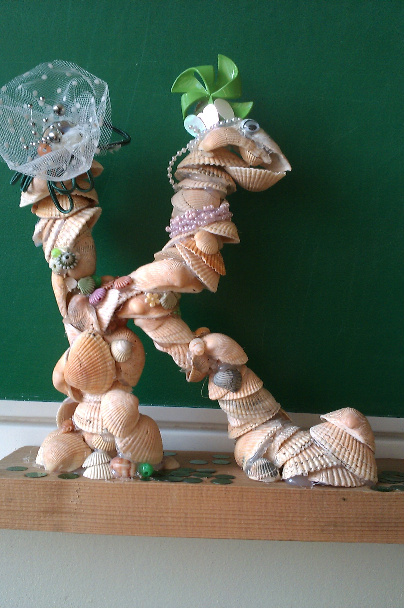 Буква К изготовлена из ракушек. Склеены ракушки клеем ПВА. Украшена буква бантиком (хорошо видно