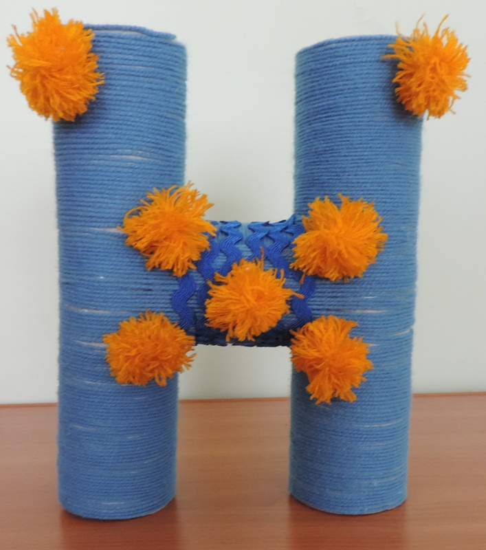 Буква "Н" выполнена из рулончиков от туалетной бумаги, украшена шерстяными нитками и пампонами.