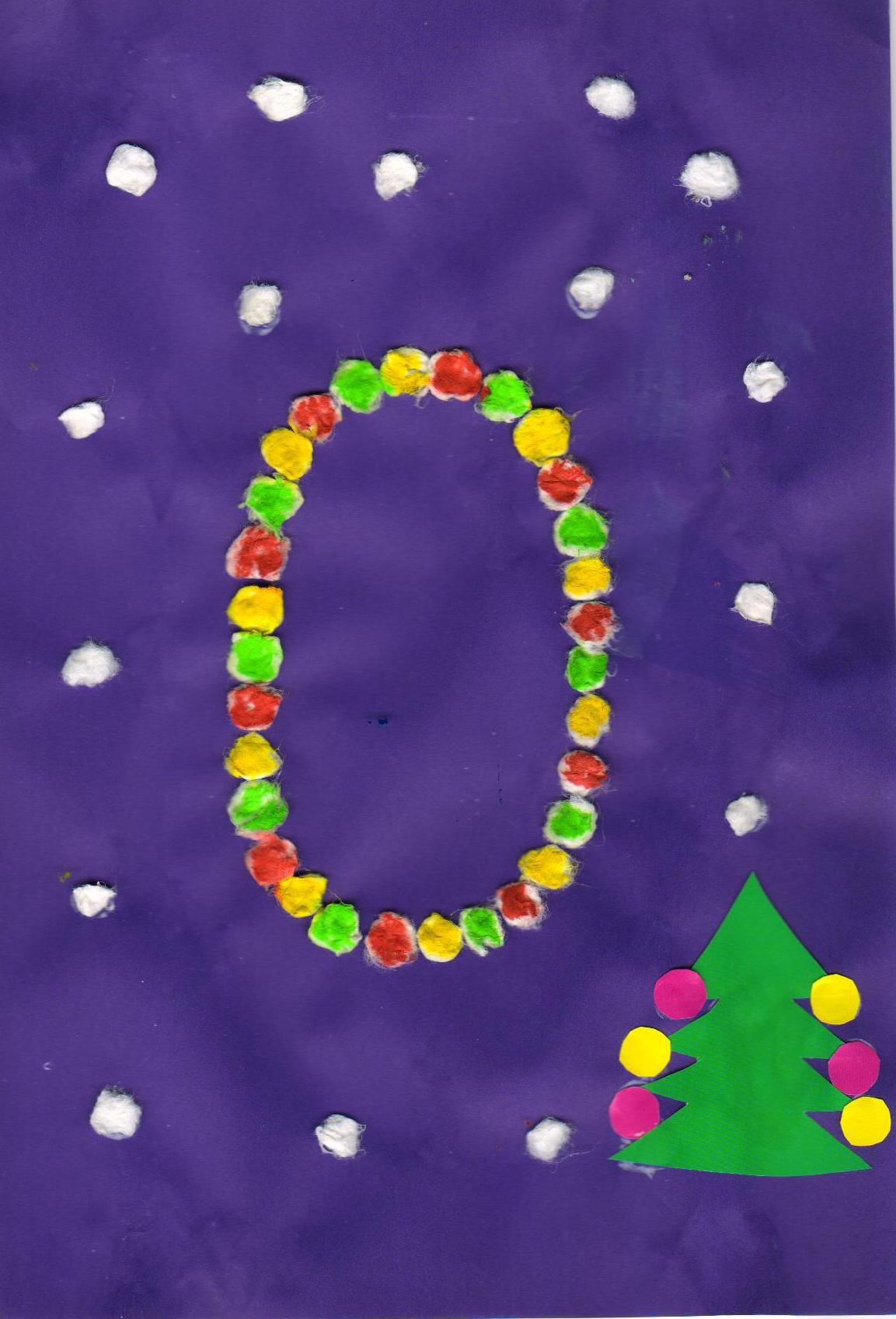 Буква "О" выполнена из ватных дисков, цветной бумаги и раскрашена гуашью.