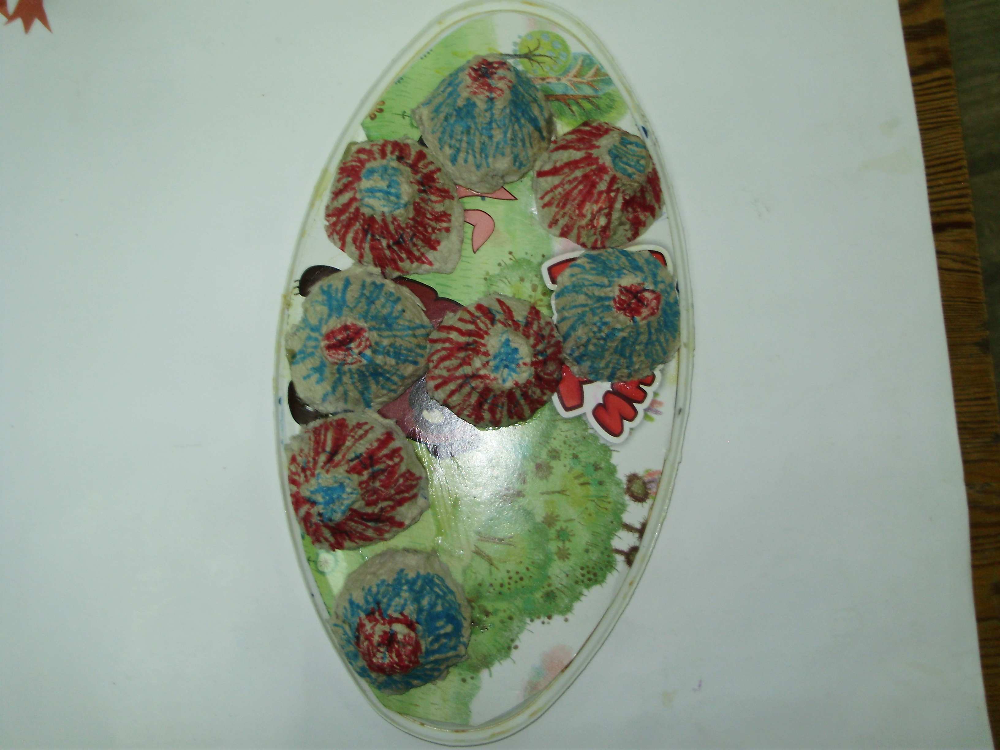 Я взял пластиковую крышку от консервов, приклеил на неё ячейки от яичных упаковок по контуру буквы, раскрасил акварельными красками.