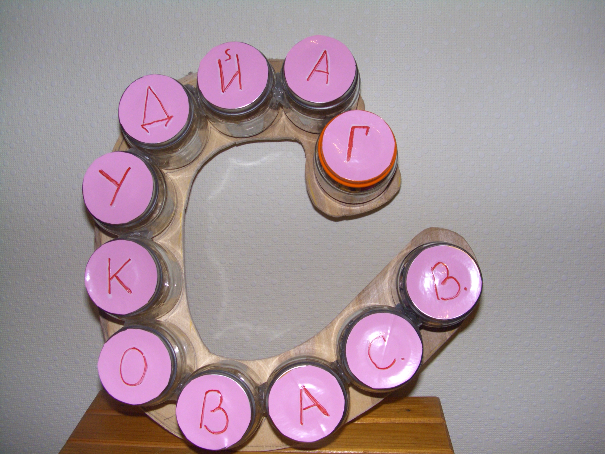 Буква С. Эту букву выбрала из за того, что мое имя начинается на С. Из картона вырезала букву и на неё наклеила крышечки.