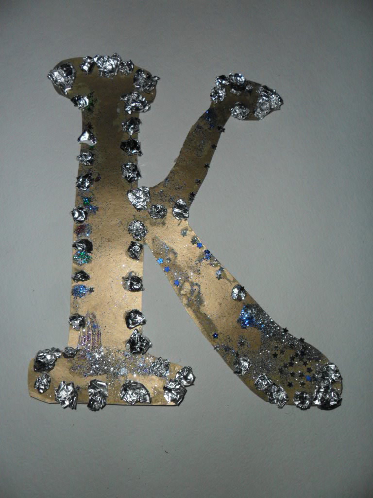 Я решил сделать космическую букву "К", вырезал из цветного картона,украсил звёздочками,блёстками (использовал клей ПВА, нанёс клей и посыпал блёстками).из фольги от шоколада сделал шарики и украсил края букву.