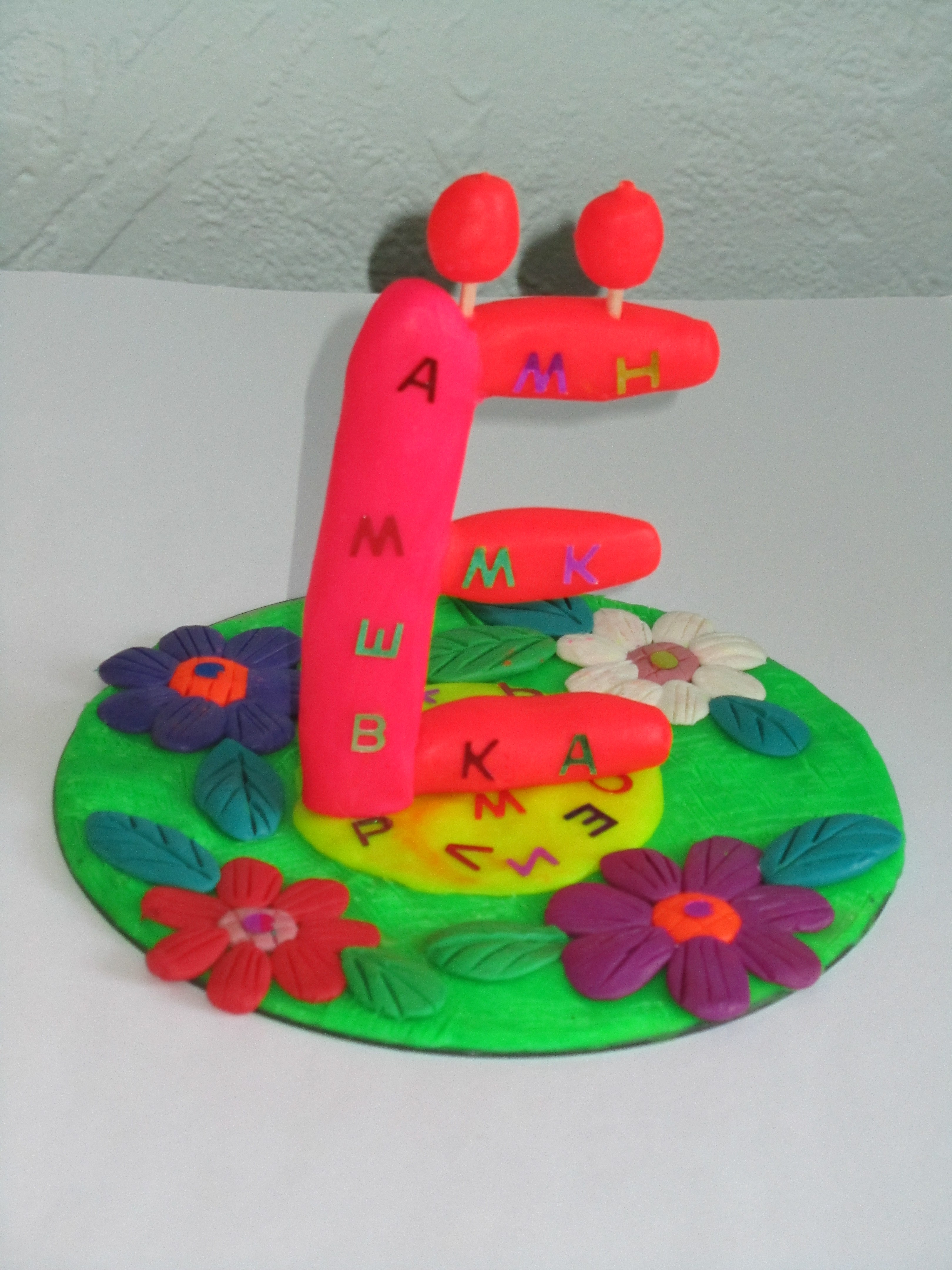Работа выполнена в технике пластилиновая "скульптура" или подойдет название на которое мы случайно наткнулись на просторах интернета "3D-апплекация" 1. В качестве основы"Постамента" работы использован бракованный СD-диск, на который в был нанесен шпателем флуоресцентный пластилин желтого и зеленого цвета , (для ребенка это очень удобно так как на диске хорошо видны "полоски" - границы перехода от одного цвета к другому). 2 Отдельно лепим цветочки, листочки ну и конечно же саму виновницу торжества букву "Ё. Тоски над буквой крепим кусочками зубочистки. 3. Для красоты используем специально заготовленные буковки. 4. Крепим все на "постамент". Готово! Всей группе понравилось, пока лепили, все хотели помочь. К сожалению групповые заявки не принимаются, а то бы наши малыши (в нашей группе "Пчелки" их 8 и всем от 4 до 5 лет).