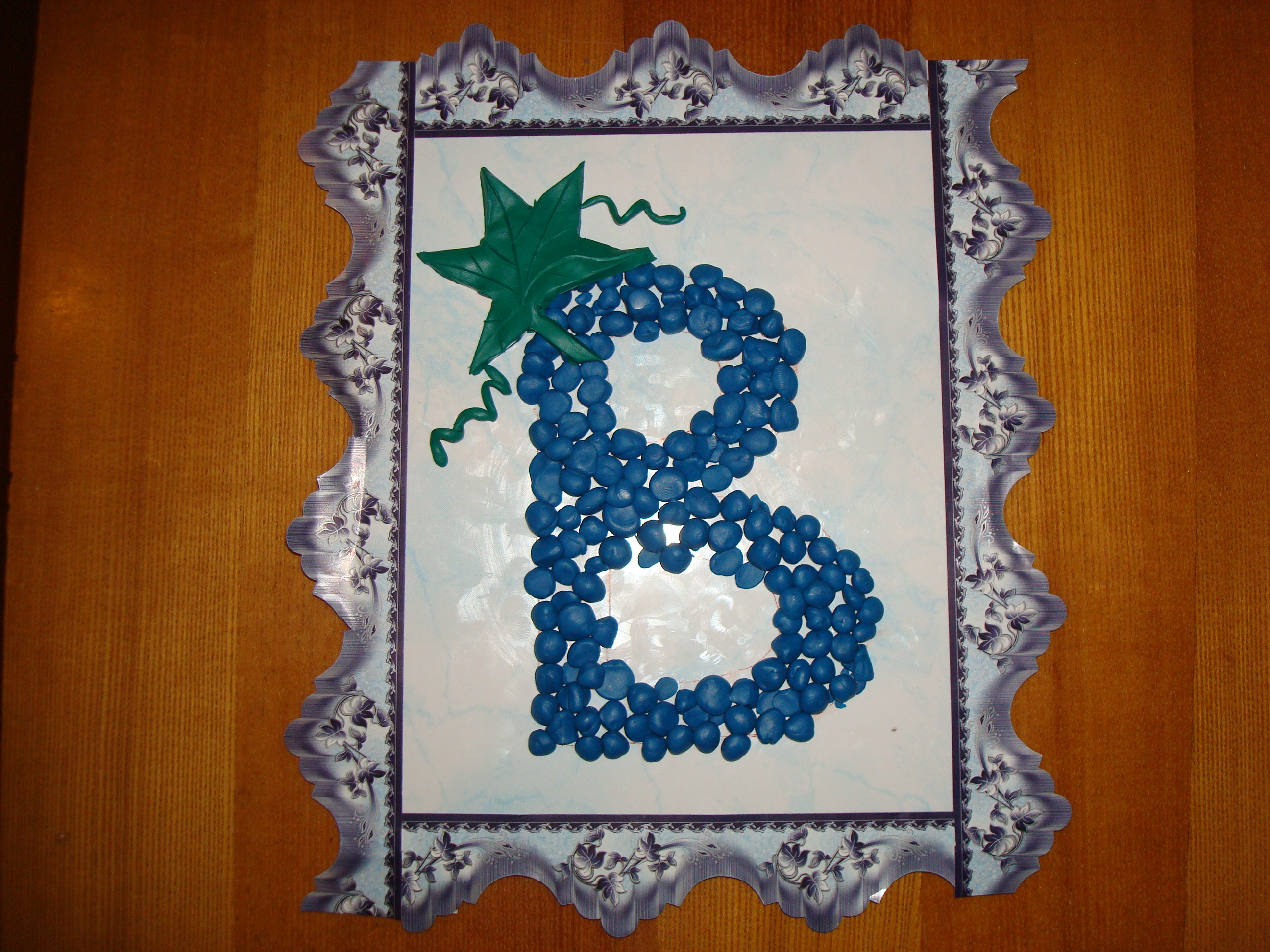 На кафельную плитку воспитатель нанесла с помощью фломастера контурное изображение буквы "В". А Олеся скатывала из пластелина маленькие шарики, похожие на виноградинки и выкладывала их на плитке, слегка прижимая. Затем воспитатель вырезала из пластелина зеленого цвета лист винограда и дополнила композицию.