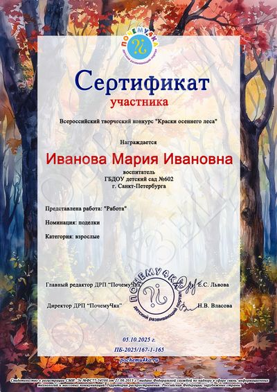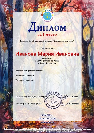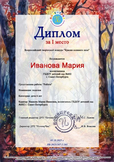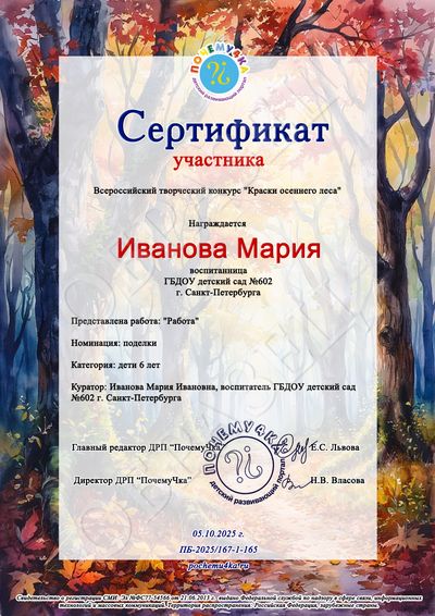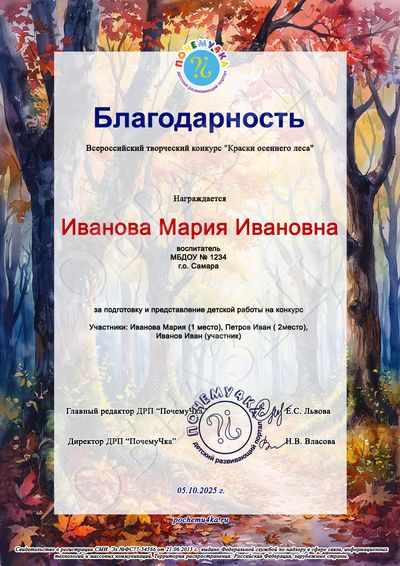 4. По желанию (если укажете в заявке) пишется статус и ОУ ребенка, например, "воспитанник МБДОУ №12 г.Москва", "ученик 4"А" класса МБОУ СОШ №15 г.Саратов" и т.д.;