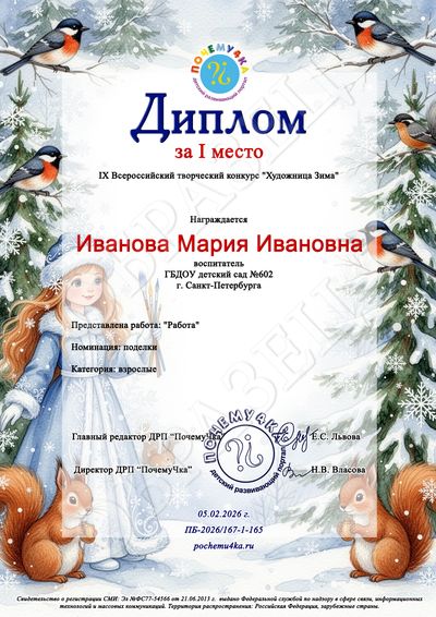 В дипломе победителя и сертификате участника конкурса пишутся следующие данные: