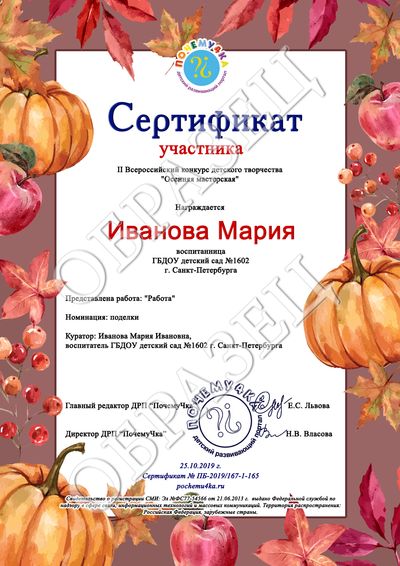 • Свидетельство о публикации материала - 80 рублей. Свидетельство выдается автору работы, т.е. если автор работы - ребенок, то документ будет выдан на имя ребенка, но имя куратора при этом тоже будет отражено в документе. Если автор работы - взрослый, документ оформляется на имя этого взрослого, куратор в данном случае не пишется.