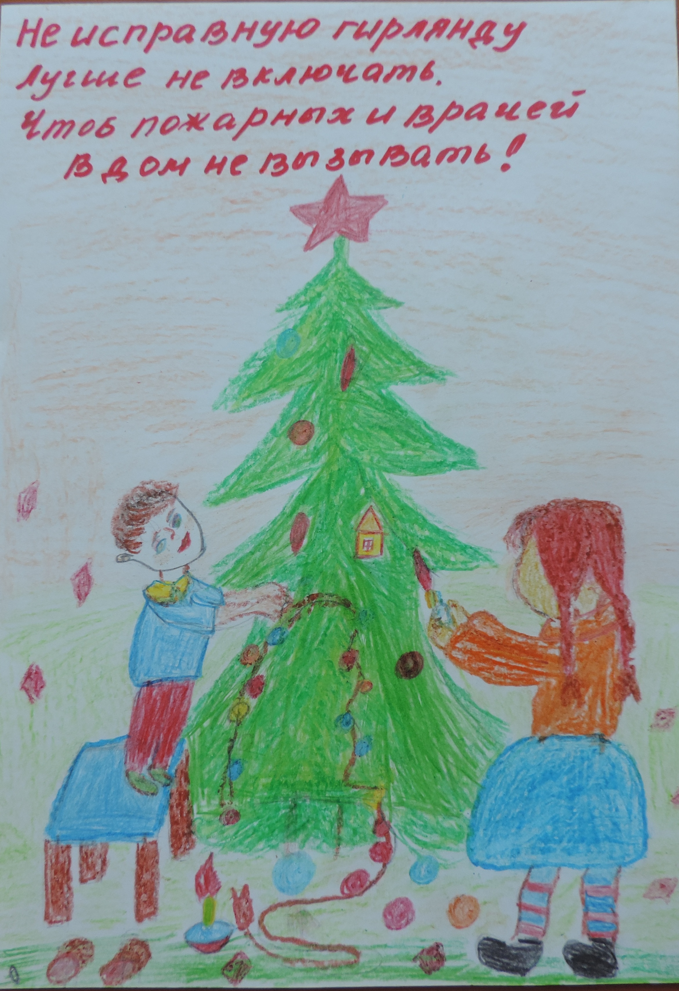 Плакат призыват не использовать неисправные гирлянды и свечи для украшения ёлки!
