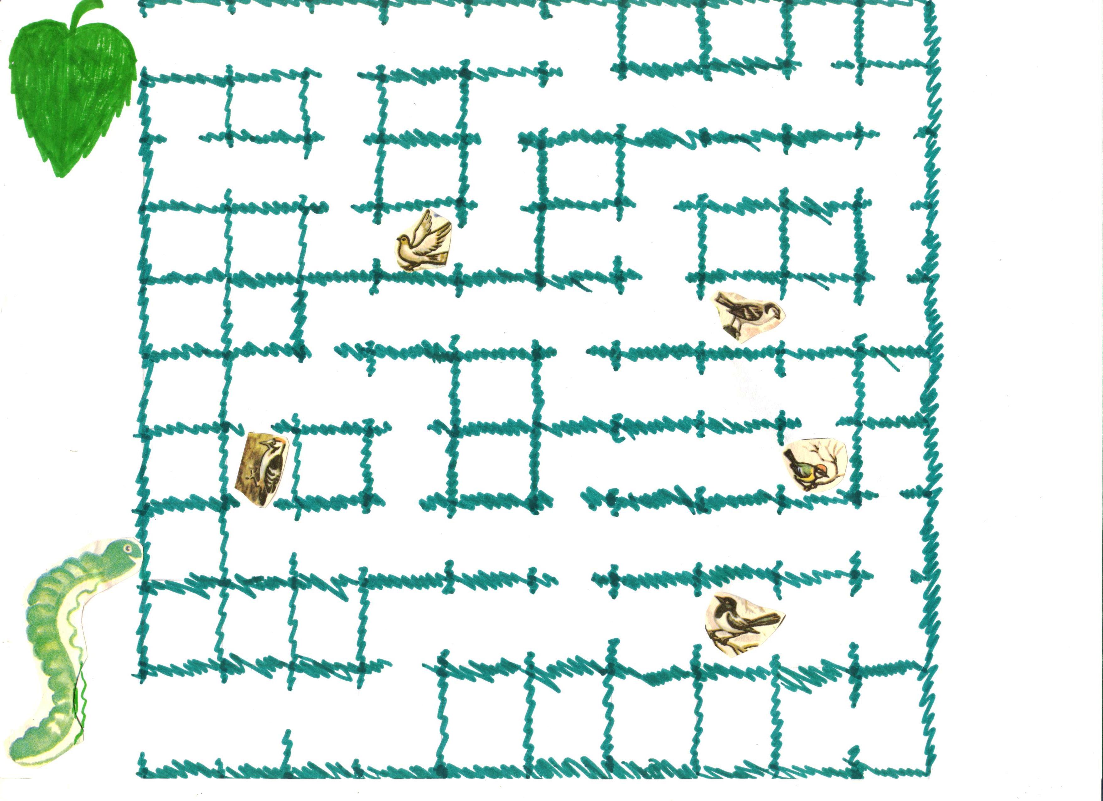 Лабиринт "Гусеница" Цель: прививать усидчивость, внимание, логическое мышление, умение слушать словесную инструкцию взрослого, ориентироваться на листе бумаги. Задание: гусеница очень хочет кушать, но попасть на листик она может только по тропинкам в траве. Вокруг очень много птиц и она их боится. Помоги гусенице добраться до листа.