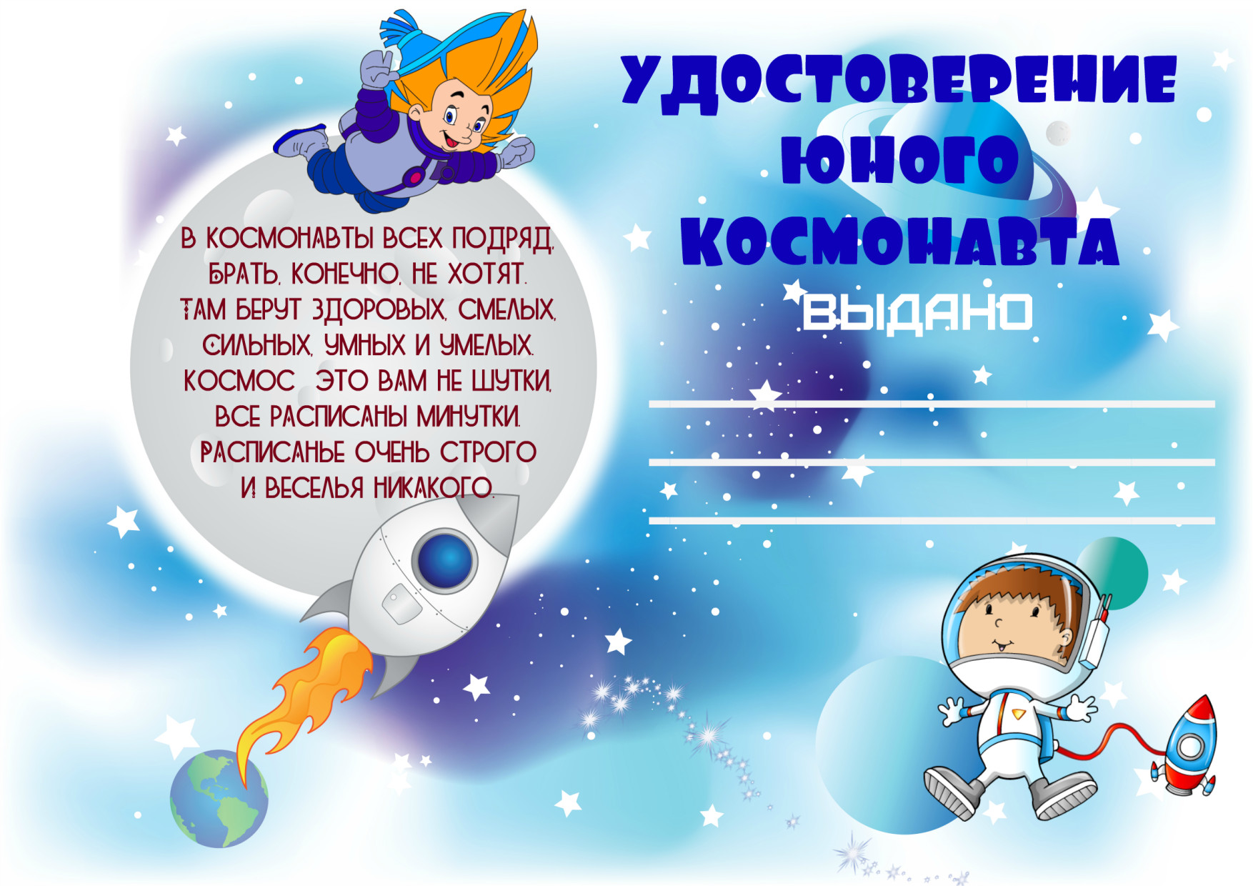 Уважаемые коллеги! Предлагаю вашему вниманию шаблон "Удостоверения юного космонавта", сделанный при помощи компьютерного редактора, способом наложения.Данный шаблон может быть использован педагогами при награждении участников мероприятии, посещенному Дню космонавтики. Такое удостоверение останется в памяти ребёнка на долгое время и будет напоминать ему о том, что он тоже своего рода герой.
