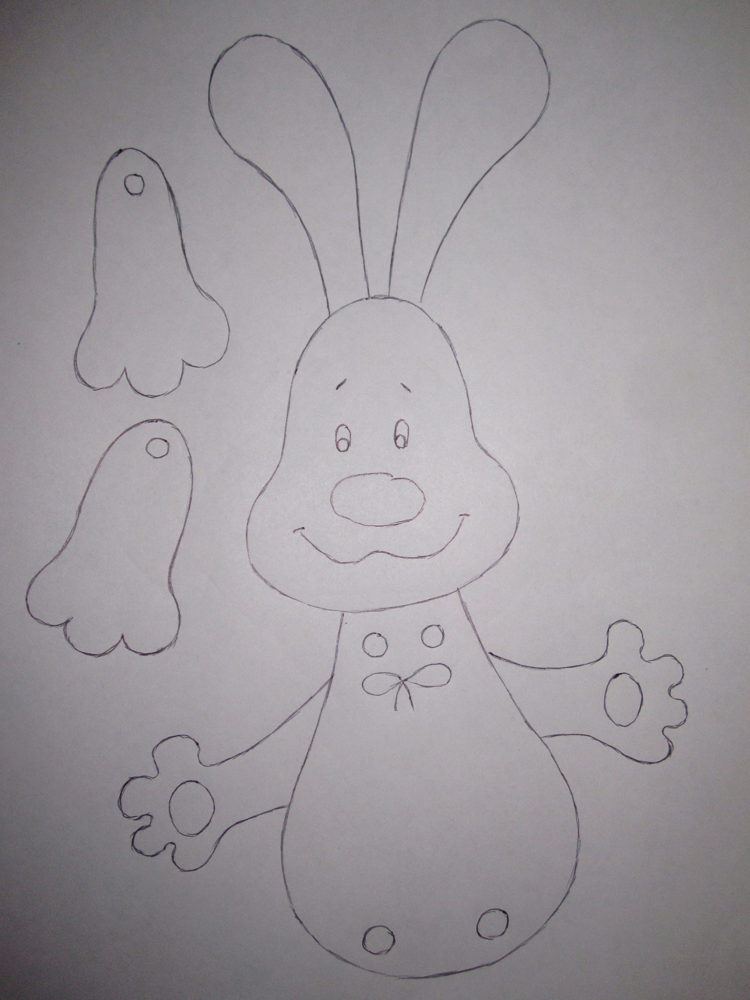 Для зайчика берем белый картон и рисуем на нем зайчика. Вырезаем, прорисовываем глазки, носик, ротик, и обводим контур зайчика черным фломастером. Дыроколом делаем две дырочке на шее зайчика и две внизу животика. Берем гофробумагу, вырезаем две полоски разного цвета, каждую скручиваем и вместе продеваем в дырочки. Из белого картона вырезаем лапки и приклеиваем к веревочкам.