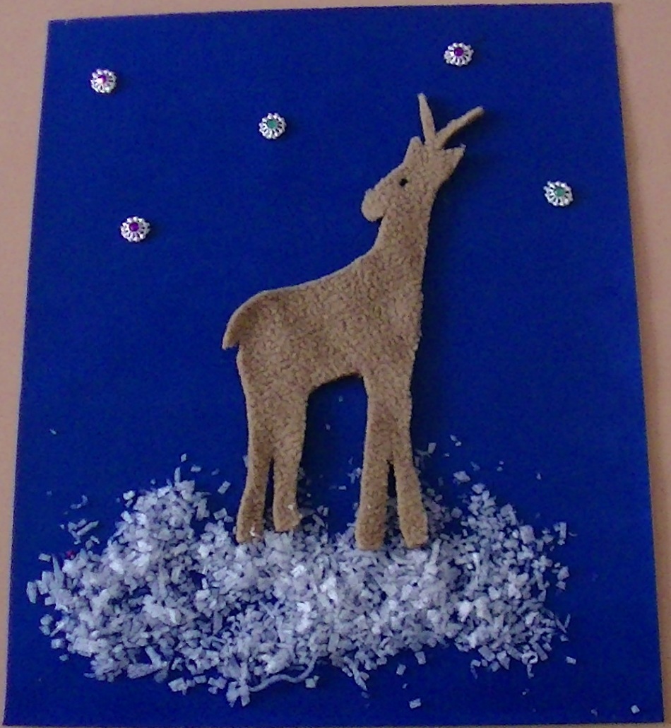 Открытка выполнены из бархатной бумаги. Оленёнка выкроили из ткани - флиса.
