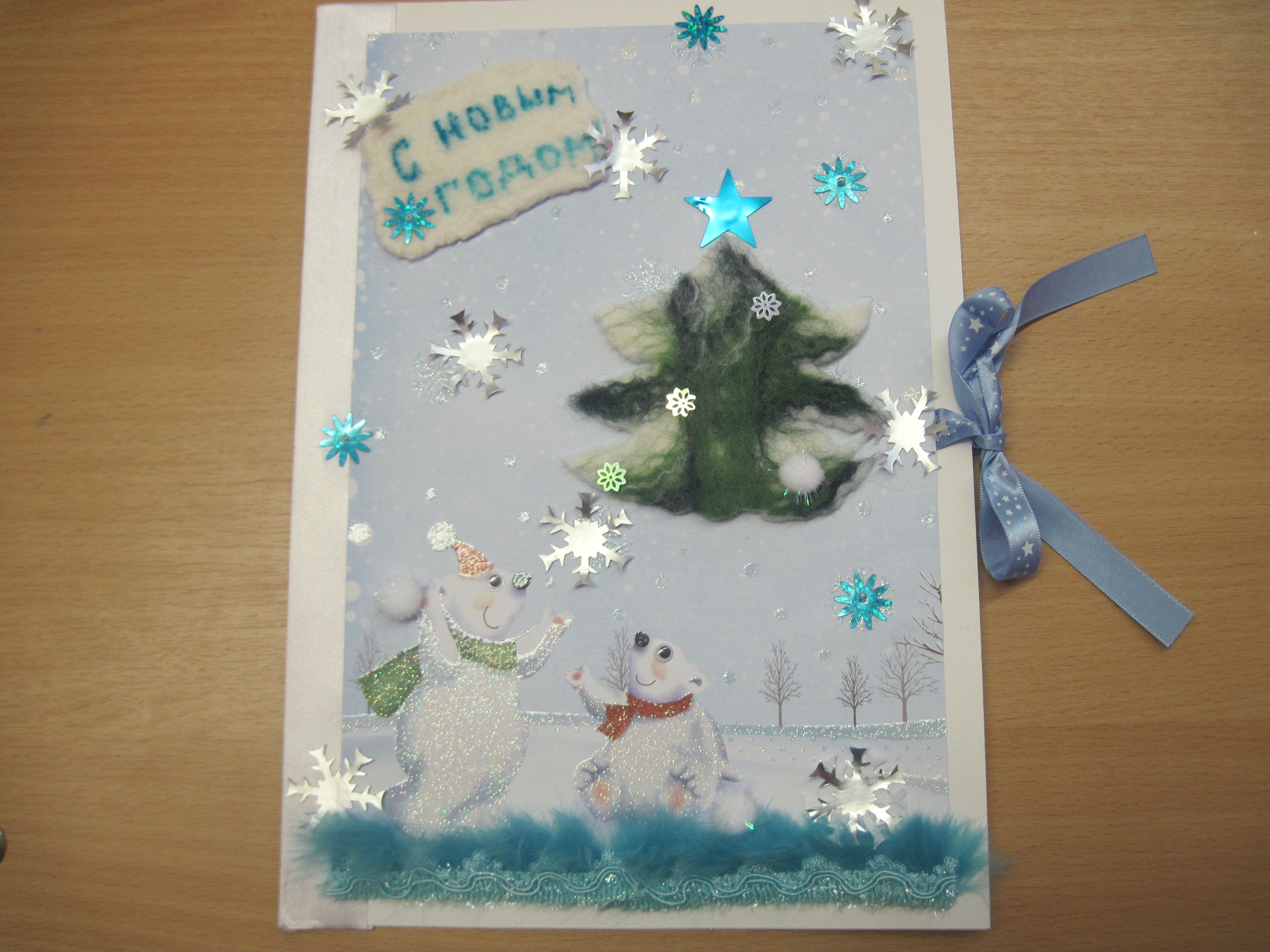 Новогодняя открытка. На плотном картоне,наклеены элементы декора, аппликация на новогоднюю тему. Использована бумага для скрапбукинга, атласные ленты, елочка из войлока, специальный дракол, для снежинок, бисер.