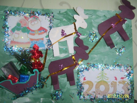 На основу выкладываем и приклеиваем сани с подарками и оленей.