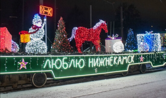 Комментарий: На фотографии изображён новогодний трамвай, который курсирует в городе Нижнекамск