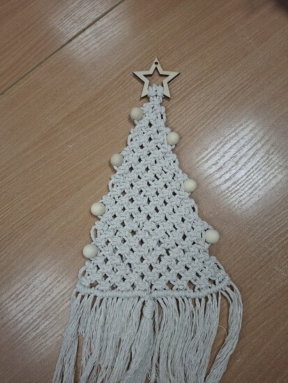Комментарий: Ёлочка созданная путем плетения узла макраме элемент "шахматка" из простого квадратного узла с добавлением деревянных бусин и подвески звезда.