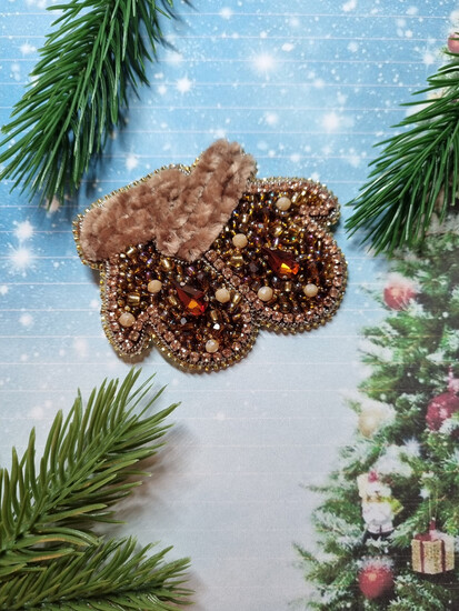 Комментарий: Брошь "Новогодняя рукавичка" символизирует тепло, уют и праздничное настроение, ассоциируясь с зимними праздниками и новогодней атмосферой. Варежки традиционно связаны с защитой рук от холода, олицетворяя заботу и комфорт, что создает ассоциацию с теплом домашнего очага и семейных традиций. Это украшение может стать отличным подарком близким людям выражающим внимание и желание окружить близких людьми любовью и заботой в зимние дни.