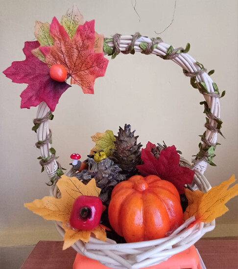 Комментарий: Декоративная корзина, заполнена дарами природы, кадровые шишки, кленовые листья, тыква, грибы.