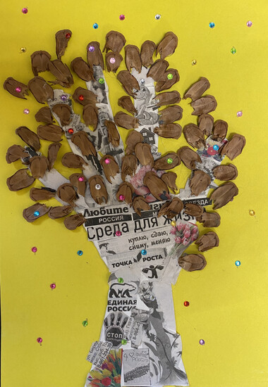 Комментарий: Обведена и вырезана рука. Аппликация газетами, природными материалами и стразами.