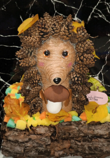 Комментарий: Осенняя поделка "Ежик". Золотая осень — чудная пора. Осень радует нас своей невероятной красотой, необычными красками. А еще осень радует нас своим богатым урожаем, разнообразным природным материалом. Осень не прошла незаметно и для нас. Воспитанница первой младшей группы №9 "Родничок" ( воспитатели Кныш Л. Н., Позднякова Т.А.) Шнякина Ева вместе с родителями смастерила осеннюю поделку "Ёжик".