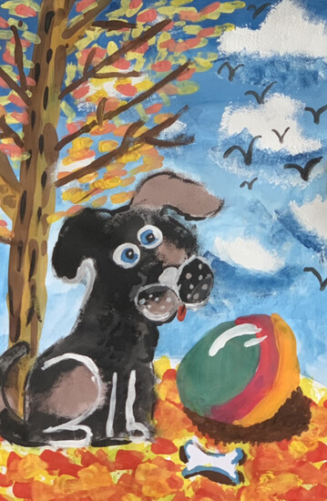 Комментарий: на работе нарисована собачка которая гуляет в осеннем парке