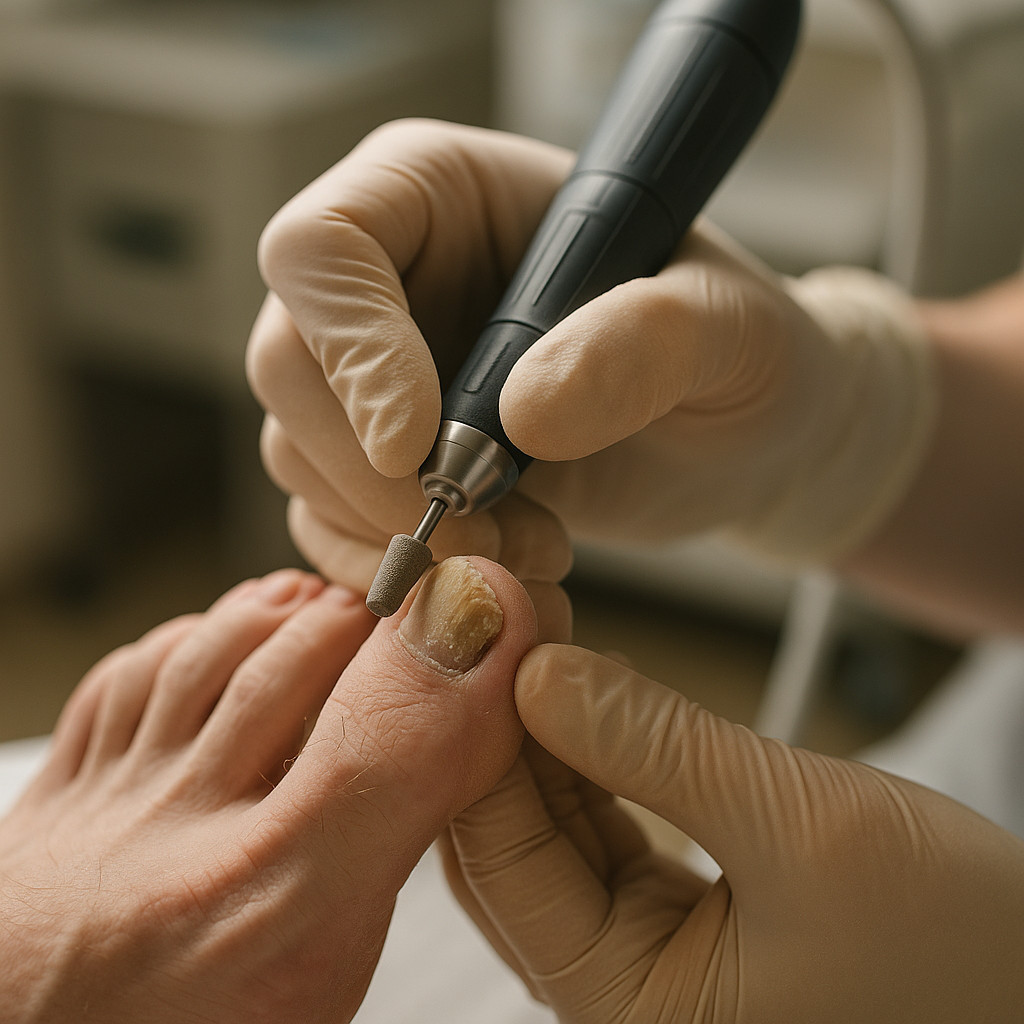 Подолог выполняет вспомогательную, но критически важную функцию в терапии онихомикоза — механическую обработку пораженных ногтевых пластин, которая многократно повышает эффективность медикаментозного лечения, назначенного дерматологом. Аппаратная зачистка утолщенных, деформированных ногтей снижает грибковую массу на 40-60%, улучшает проникновение противогрибковых препаратов в глубокие слои ногтевой пластины и сокращает сроки терапии в среднем на 25-30%.