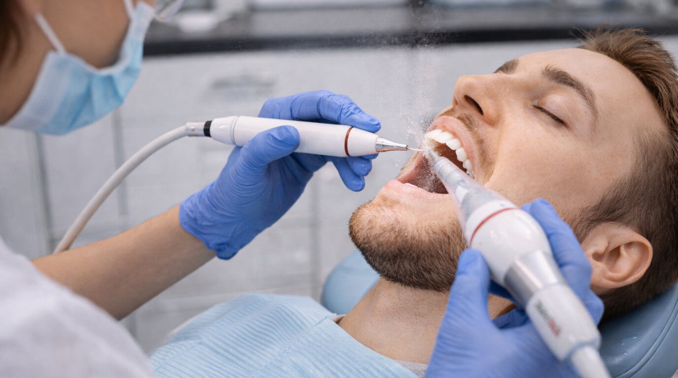 Специалист проводит ультразвуковую и Air Flow чистку зубов пациенту в клинике